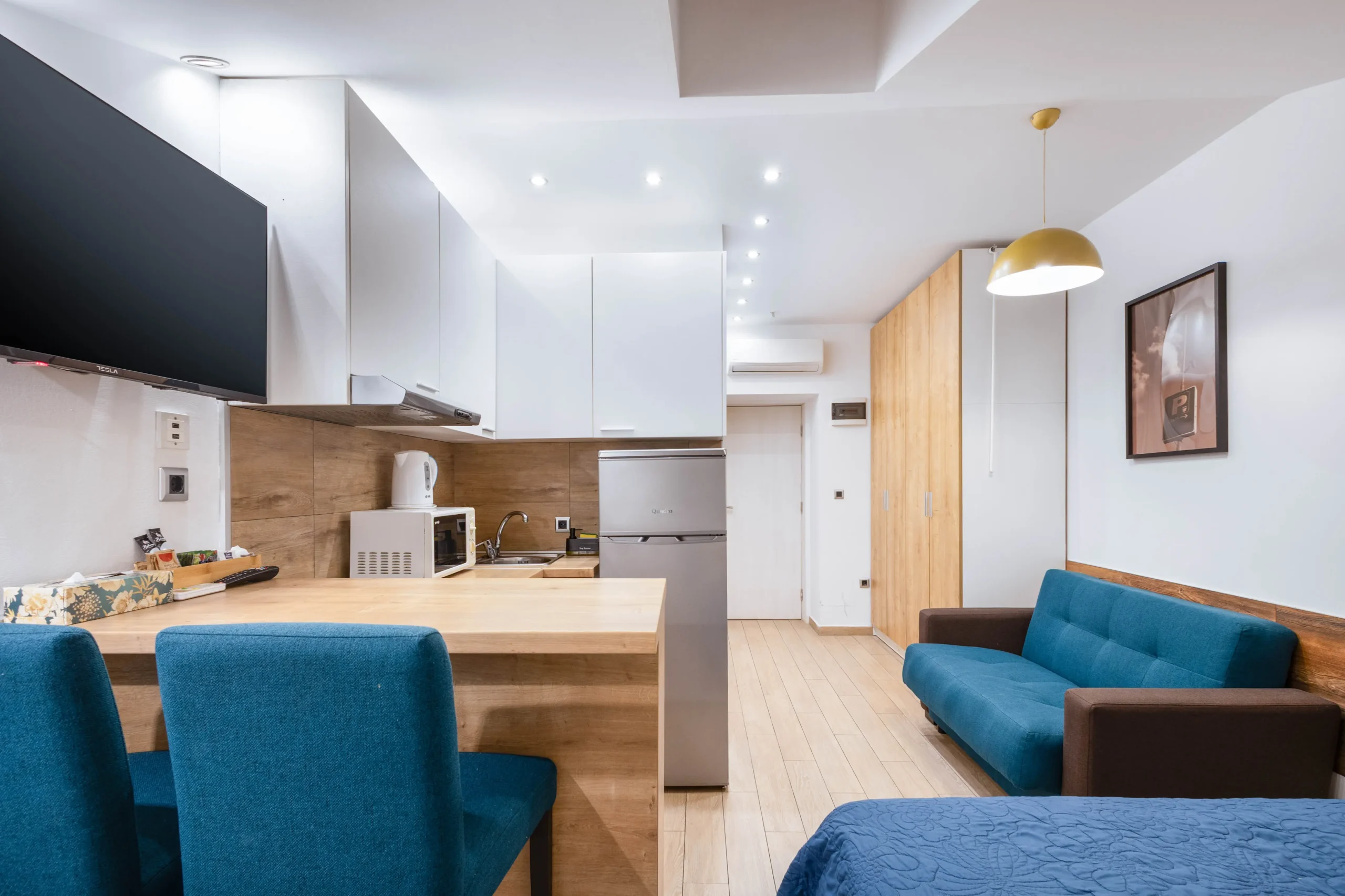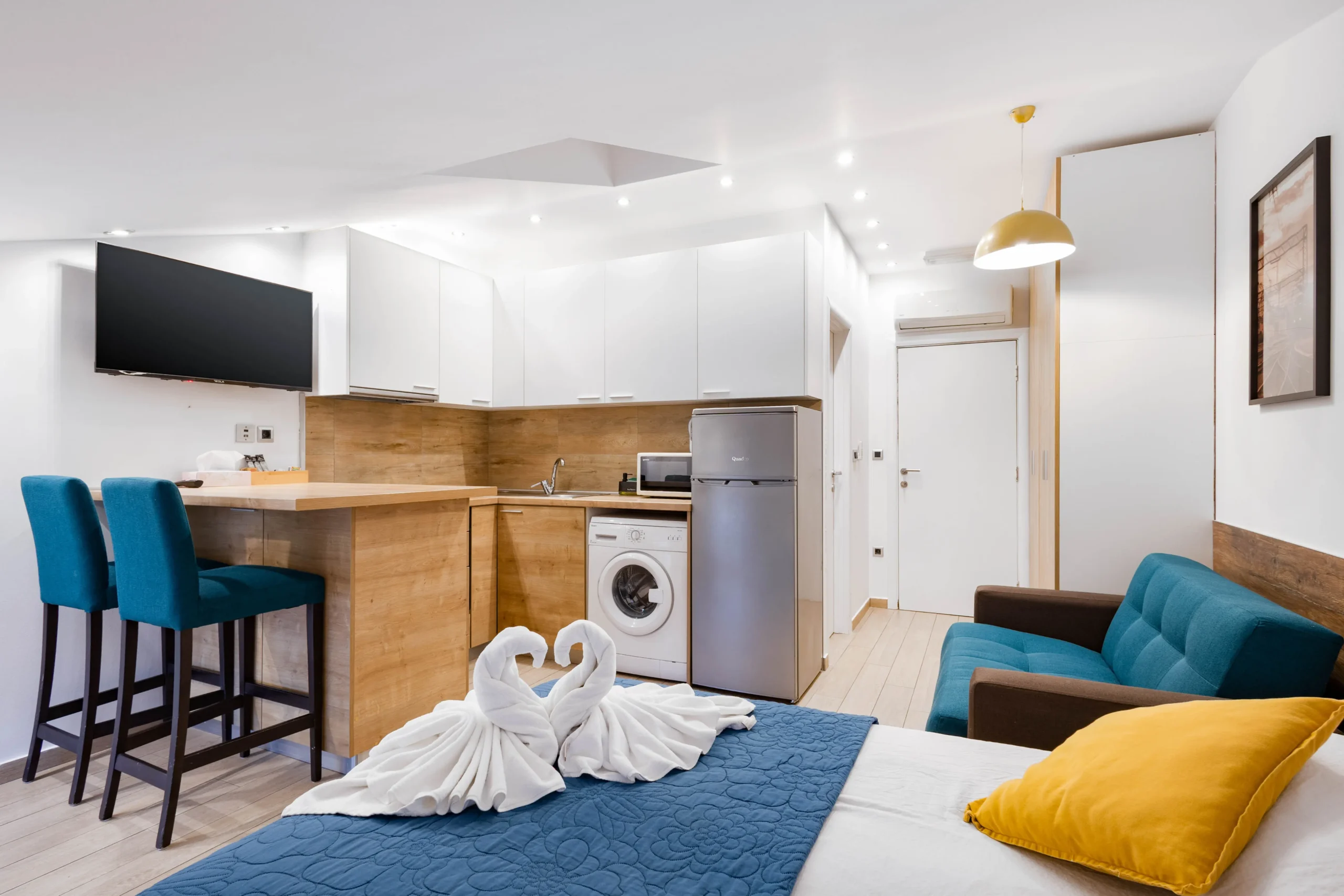 It is our pleasure to host you in our modern studio apartments, which are located in the immediate vicinity of the city center of Rijeka and the bus and train stations. Since the apartments are within walking distance of the main promenade, you will have no problem visiting most of Rijeka’s sights on foot. The apartment is located on the fifth floor, which can only be reached by stairs. The apartment is suitable for couples with or without children as well as business travelers, there is a possibility of adding an extra bed.